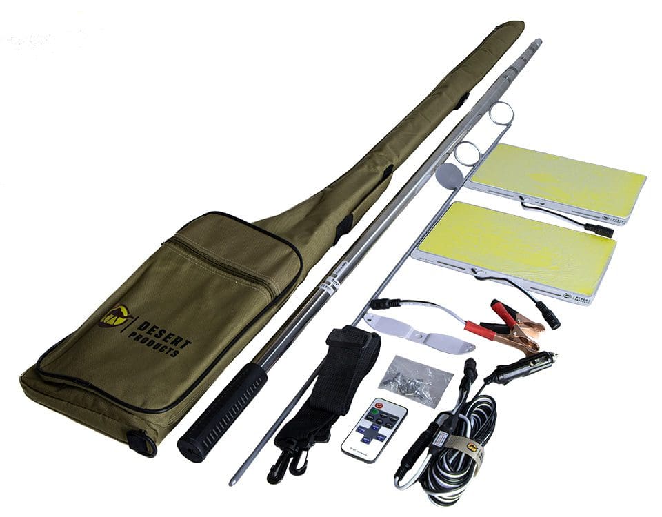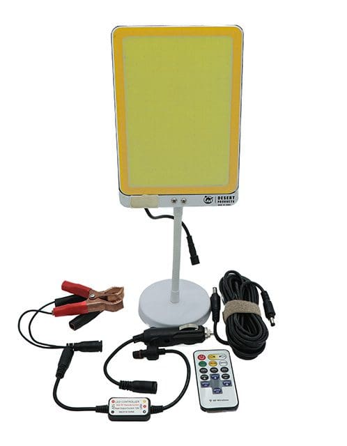 The telescopic pole is made of stainless steel. The light source panel is covered with an optical transparent glass lens adhesive. Waterproof grade of IP67. The remote control has the ability to adjust the brightness from 25% to 100%. The telescopic pole can extend up to 5m in height, the light has a range of up to 50m. It is widely used for camping, barbecue and fishing, etc. Easy to install with a retractable design and can easily be connected to a car power supply or a 12V power supply. Comes with a storage bag.