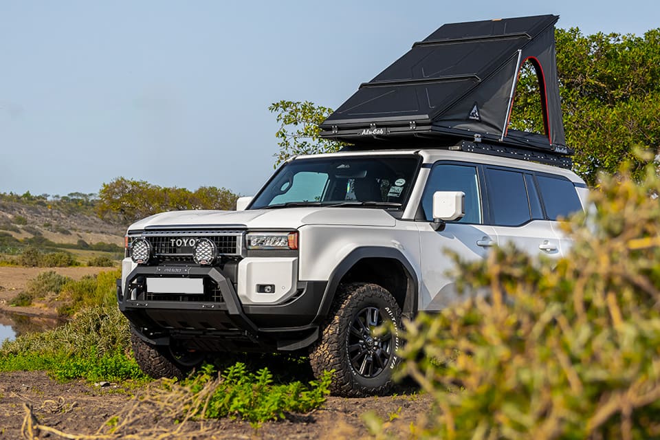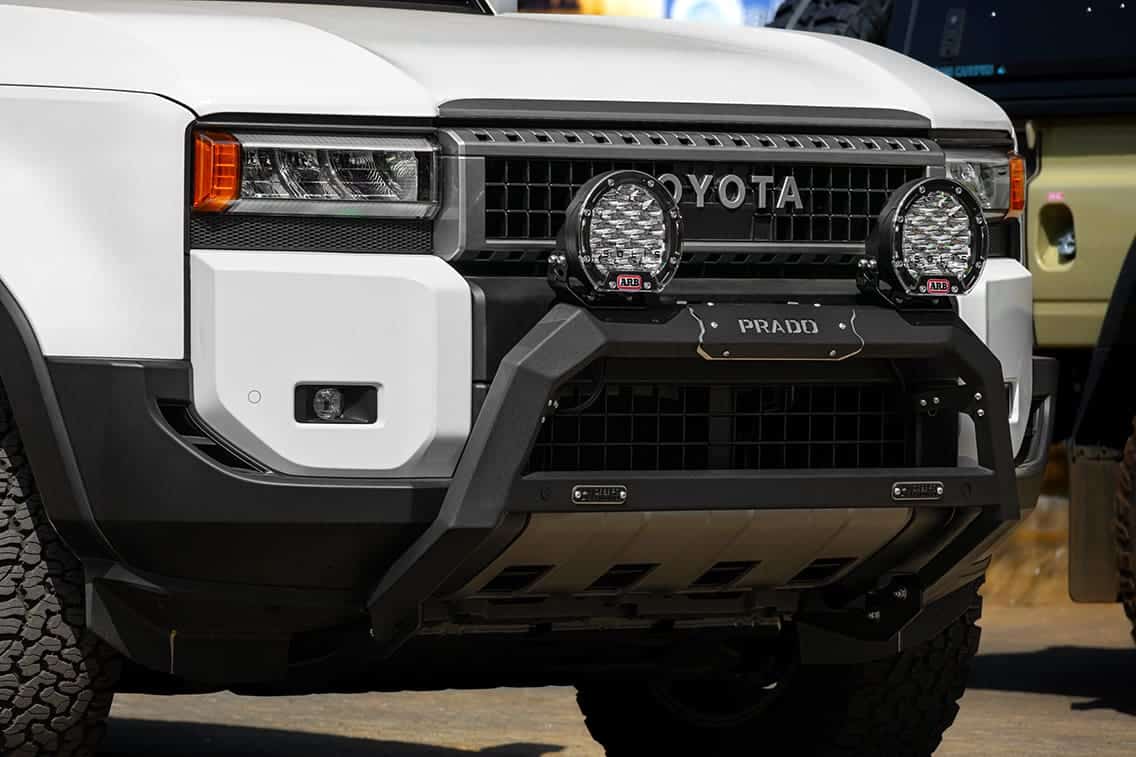 Desert Nudge Bar for Toyota Prado 250. Durable 2mm steel, stylish cut-out, and parking sensor holes. Practical, sturdy, and built to last.